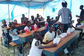 When the ACTED representatives left, the kids ran up to give me hugs and kisses on the check. It was very sweet. Since the Japanese UN Military (engineers) are demolishing what's left of the hospital and removing rubble, the children from the school are not allowed to be down there and are having school at our village under tarps. It's very fun to see all the kids running around and a little discouraging to see what school is really like.